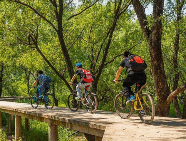 走出栈道之后,便是索道上站的过水桥,左方连接索道站房与漂流始发点,右侧就是接下来的行程目的地,古村大围。可以选择继续徒步,也可以选择骑车或乘坐观光车前行,路径总长约2500m。