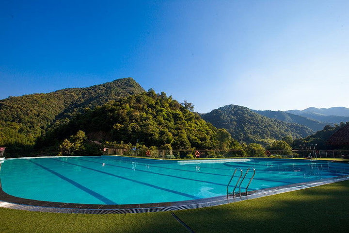 泳池的水是天然山水经过滤后,源源不断地流进来,没有循环,所以清澈见底。泳池一侧还有水中吧,在这里,喝上一杯冷饮,趴在泳池边,看着蓝天白云,青山绿水,心情真是无比的舒畅,能让一切烦恼都忘记了。