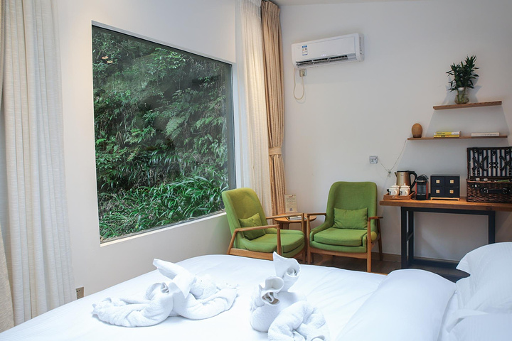 服务员会贴心将行李送到房间,打开房门,空调早已打开,整个房间特别凉爽,落地窗外的葱绿也映入眼帘,让人心旷神怡。
