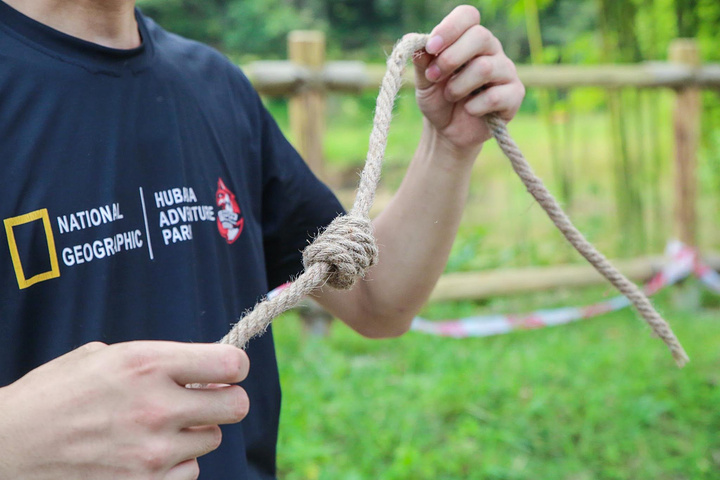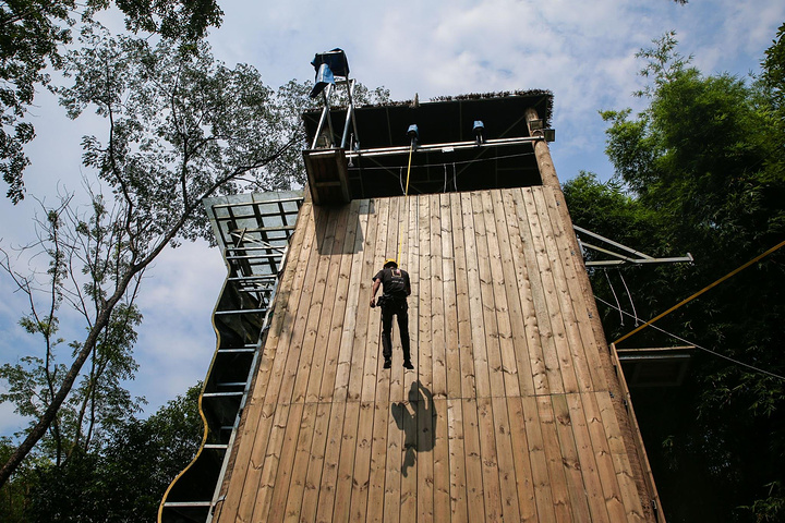 最耗体力的就是这个项目了,需要从树下爬到树上,然后从树的这一边走到另一边,两只手摇握住上方的铁锁,脚下是一条扁带。这个考验的是平衡力,稍有不注意就会整个人向后倒,但是利用腰部力量也是可以挽回的。会有两个教练分别站在两边指导,中间的距离就要靠自己了。