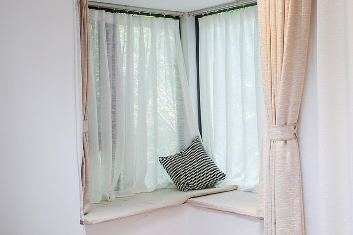 我特别喜欢这个飘窗的设计,拿上电脑坐在上面看剧,是真的很惬意了。拉开窗帘,便会发现外面一片翠绿,美好的事物,让时光也愿意停留。