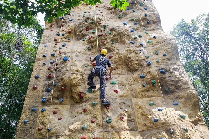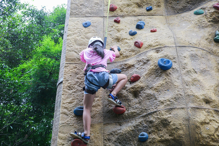 当我们到达攀岩的项目的时候,看见一个小朋友正在努力向上攀登,不得不佩服小朋友的勇气与力量。攀岩以其独有的登临高处的征服感吸引了无数爱好者,考验了攀岩者的力量与技巧,往往很多时候还没攀到顶就体力透支不得不放弃。来到这里,不妨体验一下攀岩的乐趣。