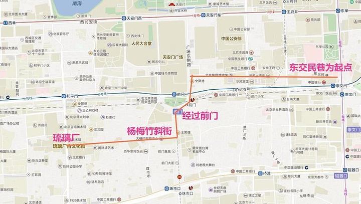 从崇文门下地铁,走东交民巷,逛完后去前门,经过廊坊二条或廊坊三条,到头后,看到一条马路,过马路后就看到杨梅竹斜街的路牌,进去后逛完就直接到琉璃厂了。从琉璃厂出来后,距离前门和天安门广场都很近,交通非常方便。