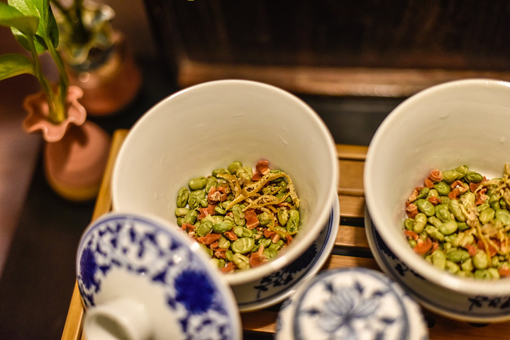 南浔最为有名的就是这眼前三道茶就是第一道茶为甜茶、第二道茶为咸茶、第三道茶则是清茶。第一道茶比较简单就不介绍了,第三道茶就是一般农家的绿茶,而第二道茶则是南浔最具特色的茶,采用了七种原材料制作而成的。