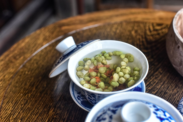 在南浔除了自然风光和人文历史之外,还有令人不得不生起食欲的舌尖诱惑。大概这里自古以来农业结构与手工业的缘故,在南浔古镇吃到的食物与江南其他水乡古镇差不多,唯一不同的是有自己特有的“三道茶”。关于三道茶就是第一道茶为甜茶、第二道茶为咸茶、第三道茶则是清茶。第一道茶比较简单就不介绍了,第三道茶就是一般农家的绿茶,而第二道茶则是南浔最具特色的茶,采用了七种原材料制作而成的。