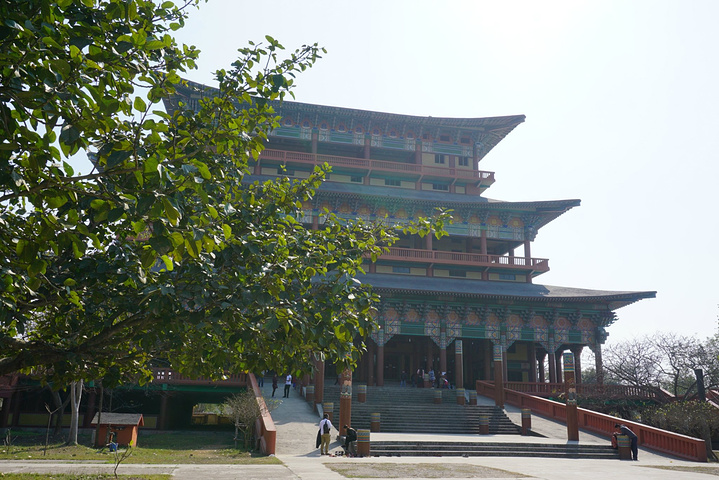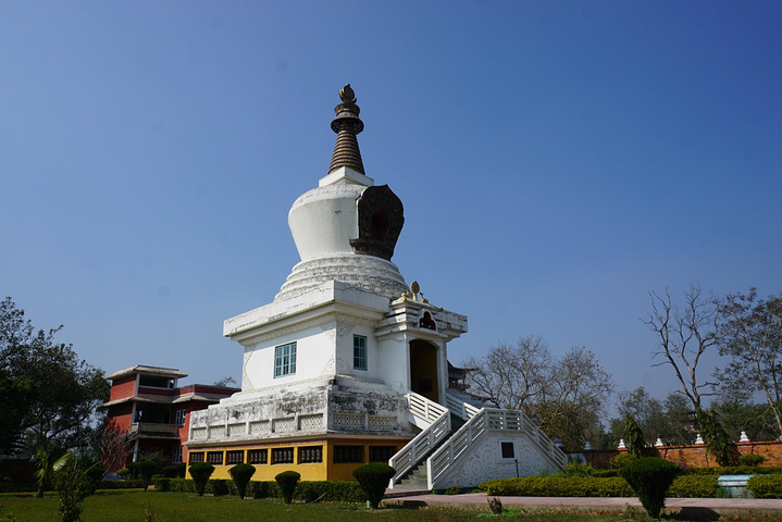 在花园坐了一段时间,骑车去了寺庙区,由蓝毗尼花园而衍生出的国际寺庙区是各国佛学交流的窗口。园区以人工河为界,河以东是小乘佛教区,因东南亚笃信小乘佛教,故主要有缅甸寺、泰国寺、印度寺、柬埔寨寺,斯里兰卡寺几座,每座寺庙都充分体现了本国的建筑风格,如缅甸寺为大金塔型,泰国寺仿清莱白庙而建,柬埔寨寺顶是典型的四面佛,斯里兰卡寺则为环形,类似于其西古城波隆纳鲁沃的遗址。河以西是大乘佛教区,中华寺、韩国寺、尼泊尔寺、德国寺、越南寺等都在这边,最热闹的就是中华寺门前了,因为咱们这寺是整个园区中最气派的,前后两进院落,红砖为墙,琉璃金顶,虽然规模和国内比算不上什么,但在蓝毗尼,处处都透着豪华,当地民众大多也会来此参观或祈福。