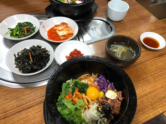 吃石锅拌饭的,在明洞巷子里,据说是最好吃的石锅拌饭,味道还行,海鲜饼很香,但是我觉得没有那么夸张啦,就一般般,人很多,本地人也很多