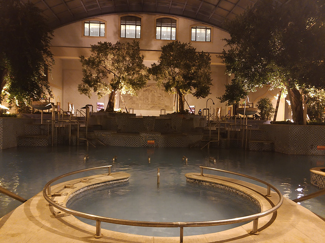 冲淋后先进入室内温泉区,两边是湿蒸和干蒸房,中间大大小小的温泉池,有各种水疗按摩喷头。