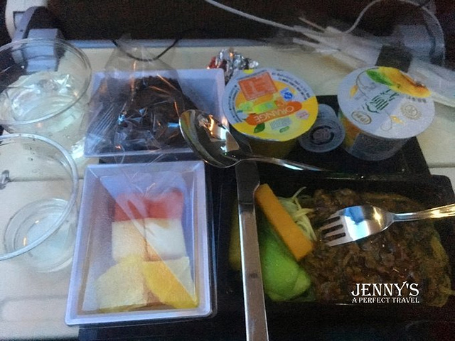 飞机餐没想象中那么糟糕,一盒牛肉意面,一小块面包,一盒水果,一杯橙汁、一杯水营养搭配够了,也许是饿了,狼吞虎咽三两下肚。由于飞行时间过长,来回好几顿飞机餐吃的也是没谁了。