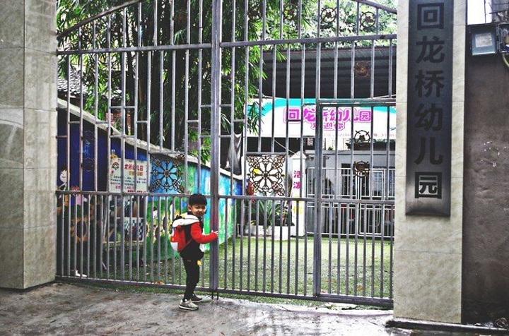 小朋友在等着幼儿园开门呢。