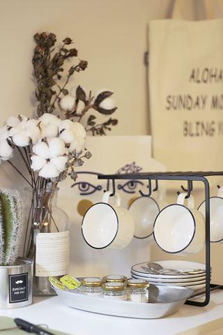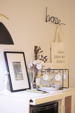 餐桌再往前,就是一个小橱柜,中层放了一个微波炉,桌面上摆放一些杯勺,主人早已为住客准备好了速溶咖啡和糖精。咖啡中毒者不再因为大半夜没有咖啡续命而烦恼了~