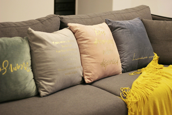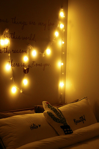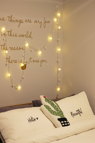 另一间房稍微小一点,装扮得很小清新,洁白被单和枕头,墙壁上粘贴着金色的英文句子,再用下灯泡给围起来。