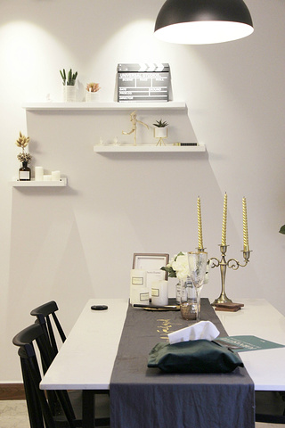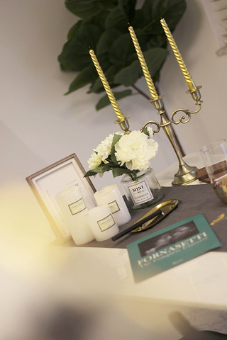 再往右手边看去,就是一张白色的长桌,桌面上摆放着各式各样的蜡烛,白色的花,金边的高脚杯...他们都在散发着高雅的气息。