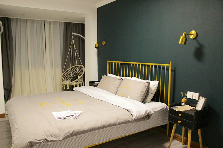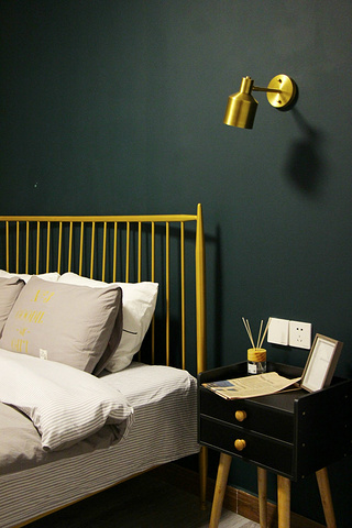 我很喜欢墨绿色墙壁和金边床杆的搭配,显得很高贵,而且散发着赫本时期的感觉,床头柜桌子上随意摆放的泛黄纸张登印的英文报纸,更是凸显房间的英伦特色。