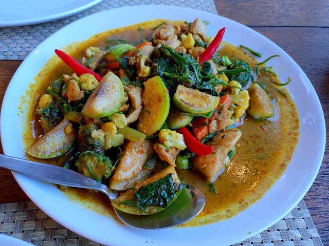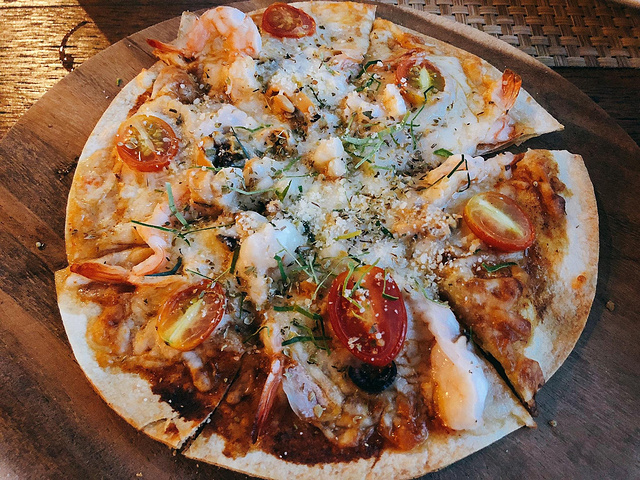 翻开菜单的时候,打消了我们其中的一个疑虑,价格也并不是天价。菜单上琳琅满目的菜品,我们点了两个菜和一个冬阴功味的披萨,不得不说这批萨也是相当迷你,但是味道特别特别好,香香脆脆的,其他两个菜倒是有点咸,如果是下饭的话正好。
