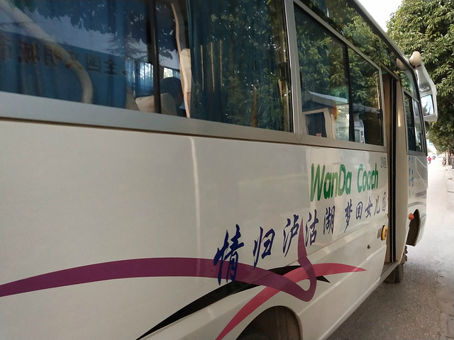 继续等车~终于等来了~~老公以为是36座大巴车,结果到了是18座泸沽湖特色中巴车~