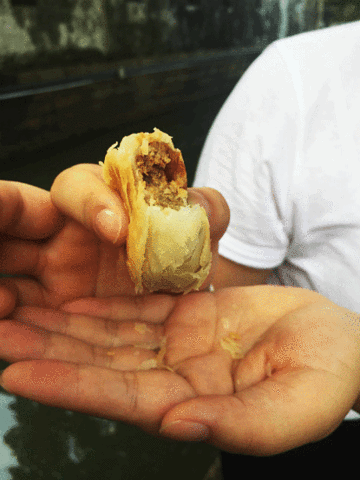 一层层的酥皮包裹住鲜美有弹性的肉馅,一口咬下,层层酥皮掉落下来,香味直
