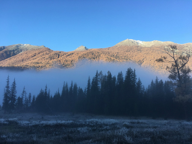早起吃过早餐,感觉在这童话世界吃上一顿早餐是无比的幸福。三湾开始了。到神仙湾9点左右,晨雾快散了,路上白茫茫一片。