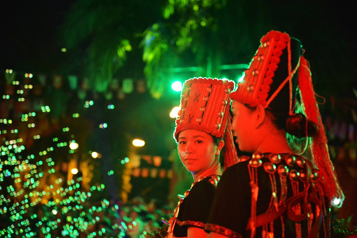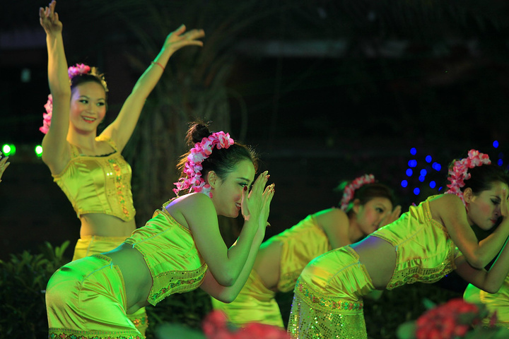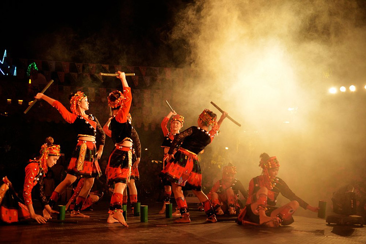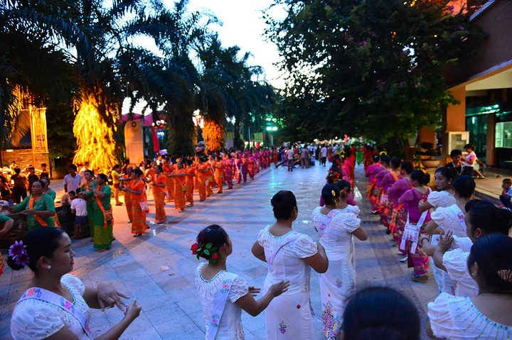 目瑙纵歌节是德宏独有的民族景颇族最大的盛会,每年正月十五举行,是一个万人狂欢万人舞蹈的盛会。要想在其他时间里体验这样的盛会,只有到珠宝小镇。小哥给我递上了一把参与狂欢的免费道具刀,踏上目瑙纵歌的舞步,开始了今夜的狂欢。随着现场震撼的音乐,激情的舞步,我的身心在此时得到了彻底的释放。