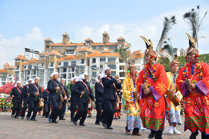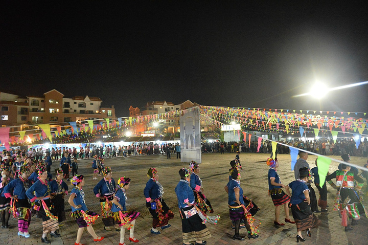 演出结束,小哥带我直奔小镇另一地点,翡翠湖广场。广场位于整个小镇中心,四周被美丽的格桑花环抱,广场周围还有着供游客休闲、购物、饮食的特产街、小吃街,但我们此行的目的并不在于此,因为这里有着一场每天都在举行的盛会:“目瑙纵歌狂欢篝火晚会”。