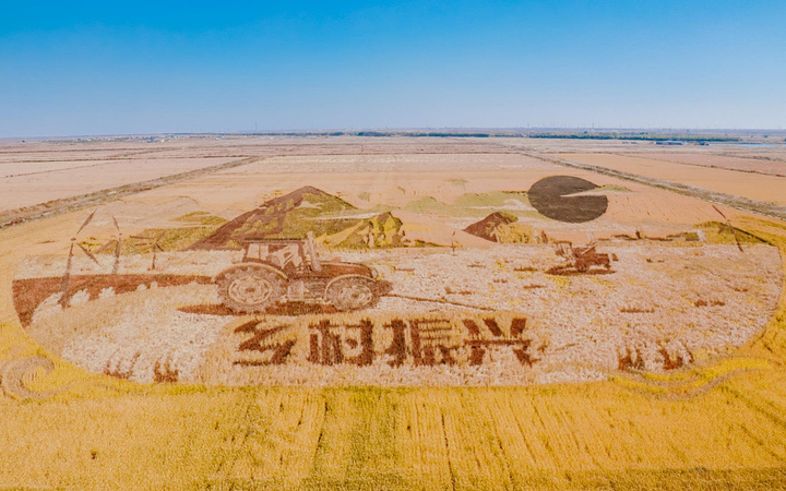 芦苇杆定点,方便农户们将同类秧苗正确插放,而后每年的五六月份,农户们开始将不同的秧苗插入田中,到了八九月,各种颜色的稻子长成,稻田画的雏形也就显现了。为了展现新时代的稻田美景,与社会主义的特色贴合,听说稻田画的题材每年都不一样,今年的作画主题则是黄河入海和乡村振兴,图案精美,活灵活现,别有一番多彩风情。