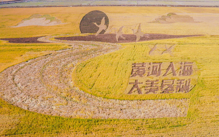 都说春种一粒粟,秋收万颗子,秋天是各种瓜果飘香丰收收获的时节,而此时的大地也褪去了夏日的装扮,裹上一层秋衣金光灿灿,别有一番风味。而这里的农田,却收获了一派奇特秋收的壮美景观,生动形象状如一幅幅精致的艺术品,这边是东营的垦利稻田画。