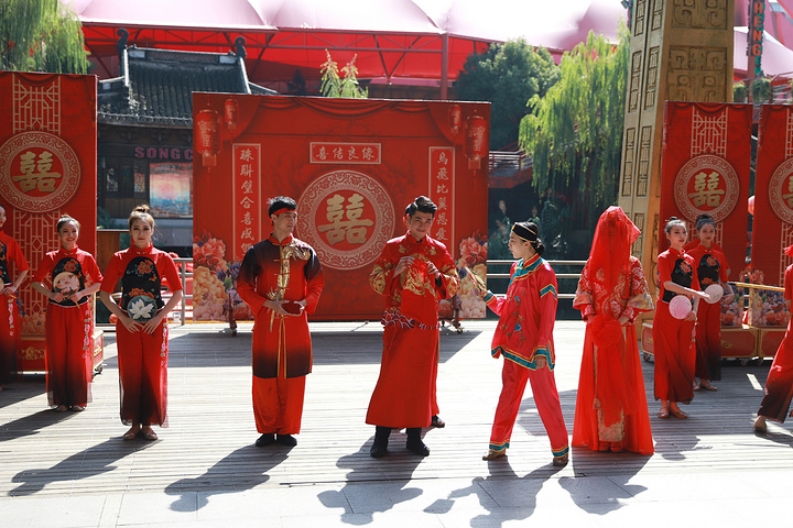是符合杭州一带的婚俗习惯的,婚礼当天,成亲的男女双方的所有婚礼过程都要在船上举行,为了配合表演,把婚礼的一部分改在了地面,现场新郎还邀请了几位游客喝了喜酒,沾沾喜气。来自游记穿上汉服,在杭州宋城,来一次穿越吧~