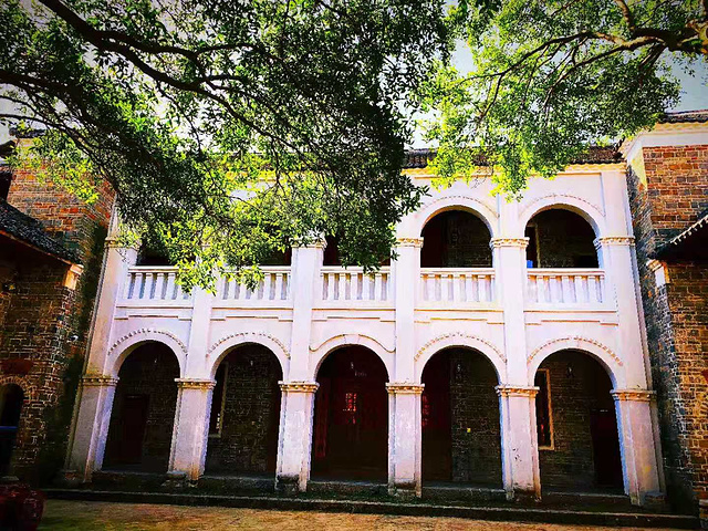 阳光洒在葱绿而浓密的树叶上,为照片效果自带光晕。背后的古楼,红墙绿瓦充满传统的中国古风,白色的正面却又富有与众不同的西洋风。中外交融,令我神往,难以自拔。此时此景,犹如梦境。