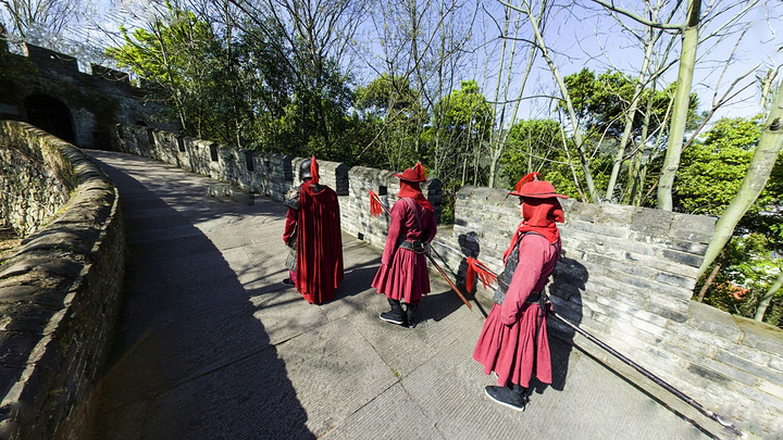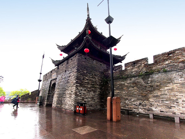 顾景楼,是江南长城从揽胜门广场入口进去的第一座城楼,造型古典,位置极佳。在顾景楼看风景,远处的巾山群塔、东湖的浩淼如烟全都成为眼中的一幅图。
