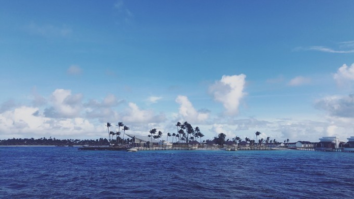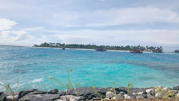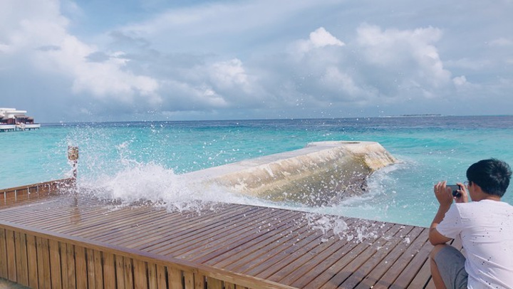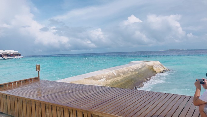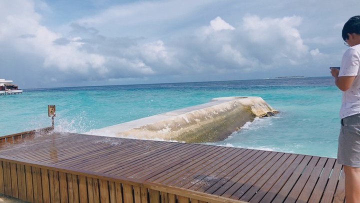 马累 酒店的人把我们送回机场,找到柜台,等人集合我们就去码头上船了。小黑会给柠檬香味的毛巾擦手,然后再分发救生衣。怕晕船就坐后排,我是全程都看着窗外的海景,闭上眼就想吐,很困也很纠结,看着海水像仙草豆腐一样,海面上一会风平浪静一会大雨的也很奇妙了,也就撑了大概五十分钟就到了。