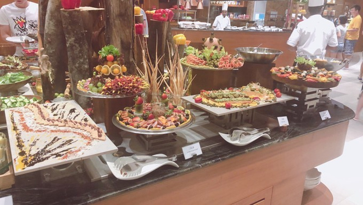 进餐厅,服务生会问你房号,就上报房号,落座,然后去拿吃的。主餐厅左边是 沙拉 居多,正中间是主食,有各种肉土豆,右边是水果甜点蛋糕,餐厅外面会有烧烤,烤肉烤虾,金老师负责去排队 顾着吃,没怎么拍照,其实我不怎么吃肉,但是入乡随俗吧,来都来了那就都尝尝吧。