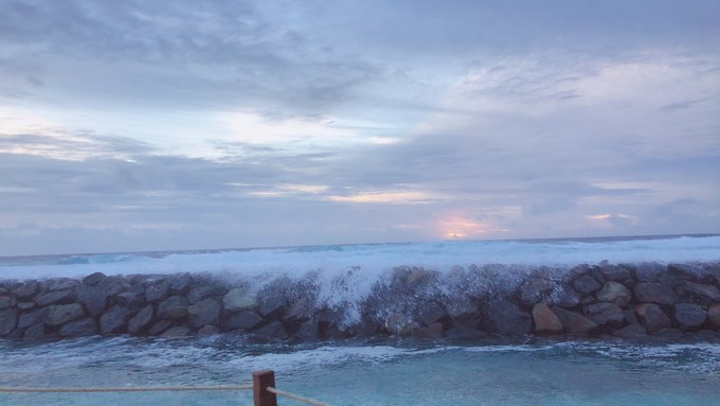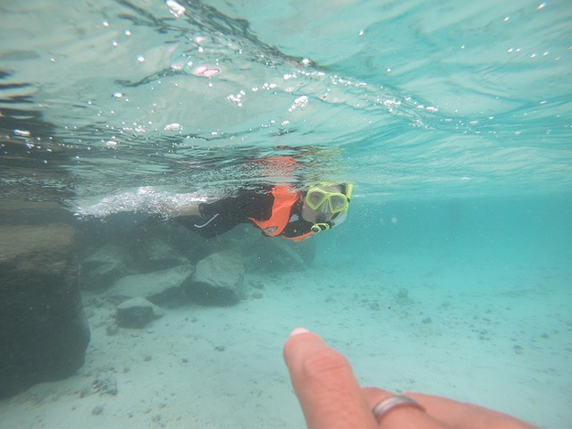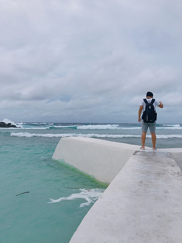 早起海浪还是挺大的,打了好几个电话,一开始说不确定有没有浮潜,到后来真的取消了浮潜,哎,没事,大家防浪堤浮潜去,过去的时候好几对已经在了,无视插着的小红旗,工作人员并没有过多阻拦。开始天晴了一阵,后来突然下雨了,工作人员就把我们喊上来了。