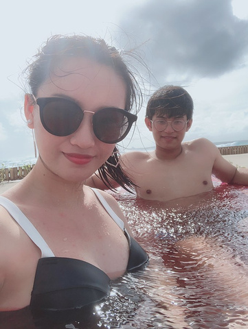 拿到水屋房卡了!等不及要拍照,拿出我的彩虹浮床,金老师很享受地泡澡去了,外面依旧是大风大浪,一整天都是小红旗。