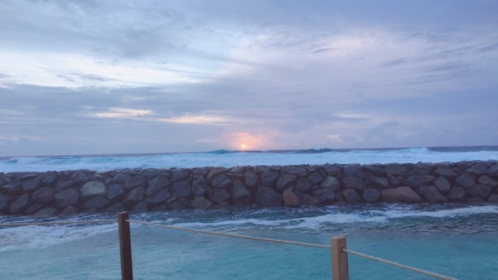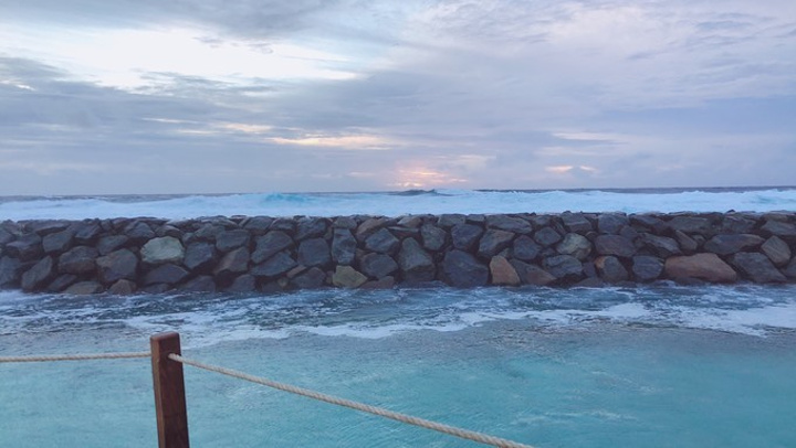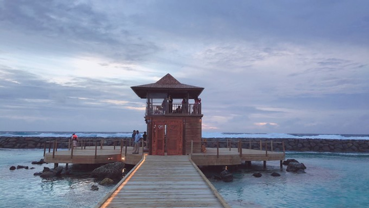 顺便定了3号的spa,开业期间一人60美元的价格不再,一个人85美元含税,我选了芳香疗法,金老师选了 瑞典 按摩法还是 瑞士 按摩来着?下午时间又是去睡觉,后来想想没有抓紧时间浮潜很失策。17点醒来,想去防浪堤看看,没想到发现了新大陆,都忘记了这个岩石酒吧,这边风浪比较小,有礁石也有🐟,可以来这里浮潜呀!(后面我们扎堆来了)
