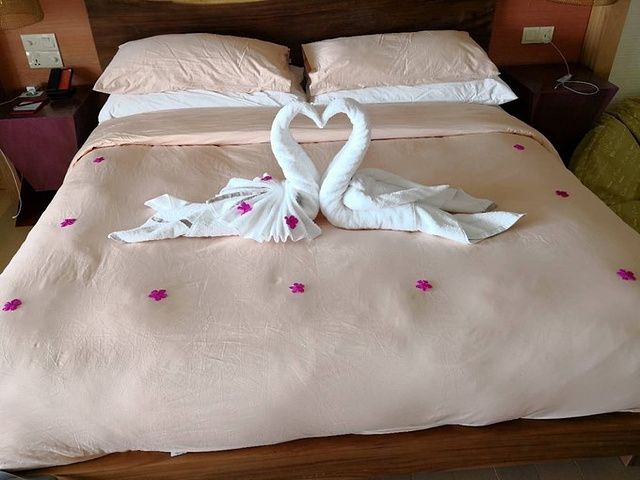 回到房间,发现已经被整理了一遍,还有小蛋糕和天鹅 ,应该是蜜月服务吧,洗洗睡,外面还在下雨,风也大,像刮台风一样,还是很担心第二天的天气的。