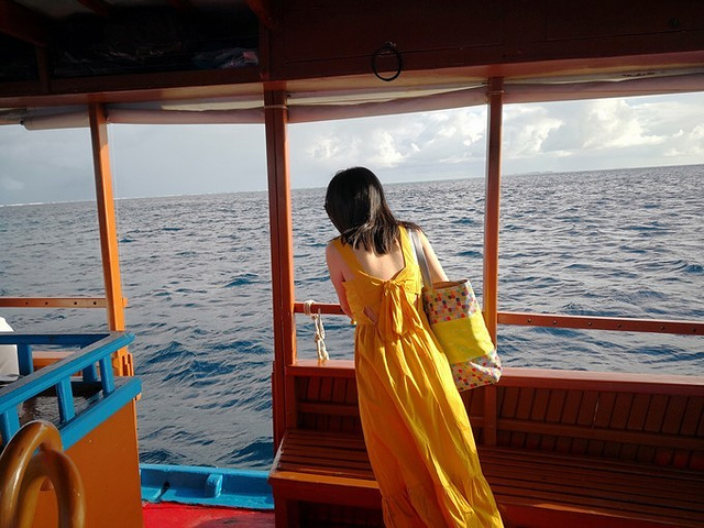 出发前很怕晕船,又吞了一片药,但是海面风浪还算平稳,小黑们会给大家拿面包吃,垂钓就在离岛不远处。这里的鱼大概都被喂钓出经验了吧,完全不上钩的,船上就俩人钓到了,还是钩到了鱼鳍的那种,怕是游走时不小心勾到了……按照小黑说的,放下去感受下拉扯的感觉,再拉上来,可是等你拉上来的时候,肉早就被吃得干干净净,平均一分钟的速度消耗一块鱼饵,感觉自己是来喂鱼的 放弃了,就跑船顶上了,发现日月同辉,阳光月光海浪有你有我 回程拍了下 蜜月岛 ,心心念念可是订不到的蜜月房。