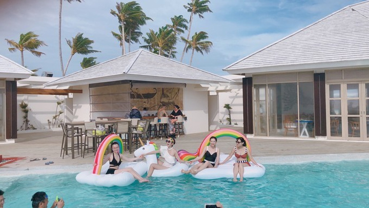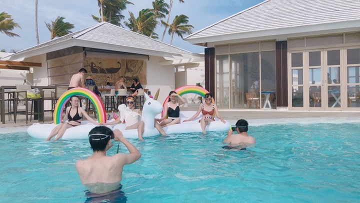 下水没多久,小黑就拉了中文小姐姐过来跟我们说不能在泳池里玩浮床,但是据说昨天有波外国人也有在玩为什么没有提醒呢?最后call来了其他俩小黑,跟我们说拍照的时候再拿出来玩,OK吧,大家都让一步,谁都不想不开心嘛。