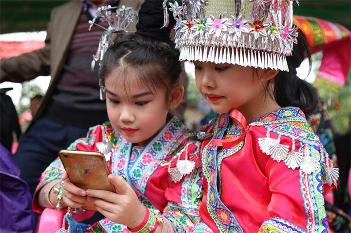 现场吸引我的是这一对小朋友,看着好看又讨喜,再看她两头上戴的银角、银帽,脖子上围的银围帕,绚丽夺目,连服装都是精美复杂的工艺。