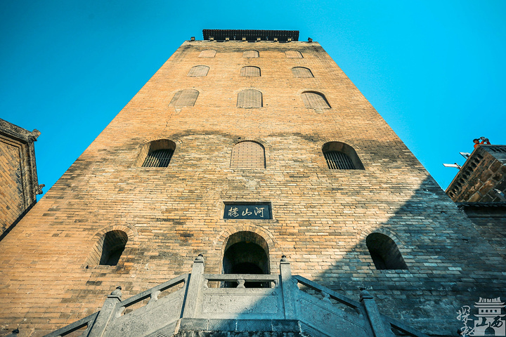 河山楼建于明崇祯五年(1632年),是陈氏家族为防战乱而建筑的工事。河山楼三层以上才设有窗户,进入堡垒的石门高悬于二层之上,通过吊桥与地面相通。河山楼楼顶建有垛口和堞楼,便于瞭望敌情保卫城堡。河山楼内生活设施一应俱全,还储备有大量粮食,以应付可能出现的长期围困。楼内曾有八百人在此避难,无一伤害。