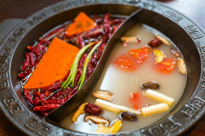 最后来揭晓这里的锅底秘密,因为老汤 里加 入了好几块大块的牛大骨,牛骨在老汤的作用下发挥出了不一般的口感体验,使汤底更加浓厚醇香。红汤煮肉,清汤煮菜,肉和菜不同的味觉体验在这一刻有了很大的区别。