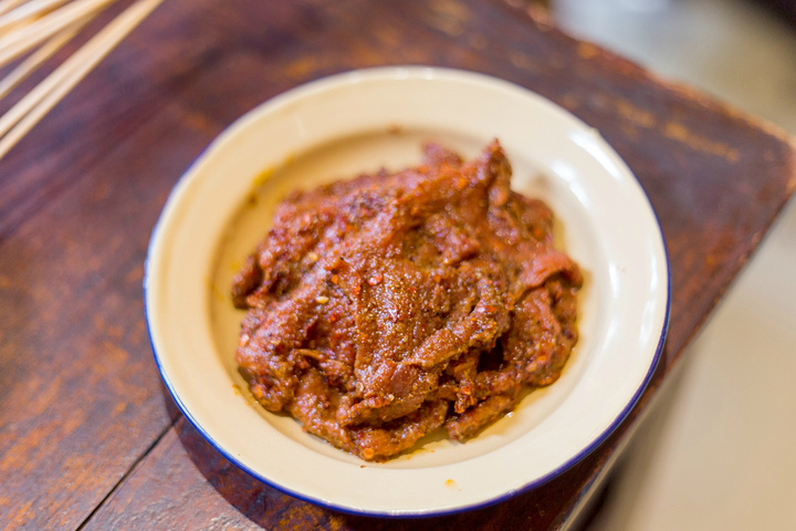 麻辣孜香牛肉,这个牛肉是提前腌制过的,料汁已经浸透牛肉,火锅煮过之后的口感更佳,不过这个肉的辣度也是不一般,不是当地人很少可以承受这样的辣度,要是钟情辣的人吃起来就会觉得非常爽。