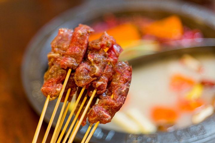 秘制竹签菲力牛排,这样的吃法还是有点与众不同,放在锅里煮一会儿,几下子就被消灭殆尽。牛肉煮的时间不宜过长,嫩一些的吃起来口感会更好。