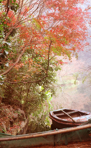 河流边被遗弃的船,和景色融为一体。