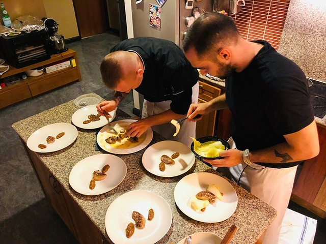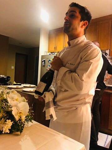 帮我们烹饪的有三个厨师,白色衣服是主厨,来自 法国 ,另外两个助手分别来自 俄罗斯 和 以色列 ,朋友说很可能会吃出三种味道哈哈。