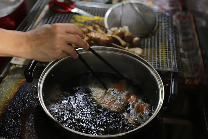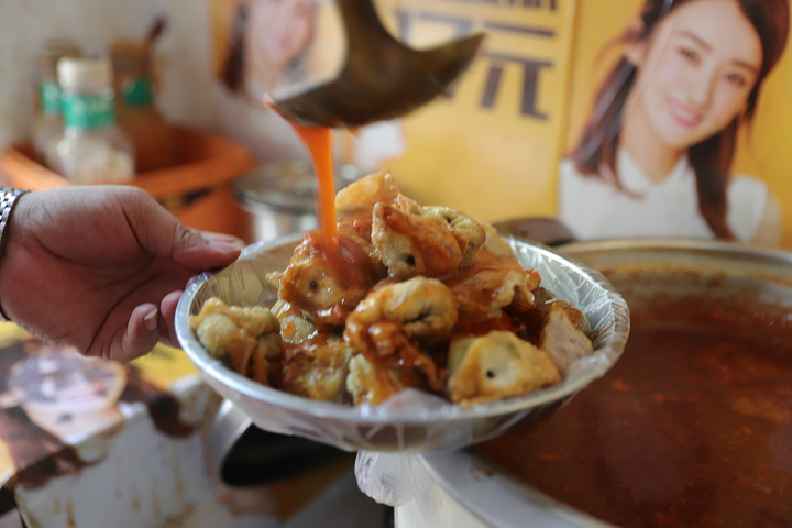 炸炸说简单一点就是一种油炸串。油炸串最为出名得地方就是乐山,但是海南得炸炸丝毫不逊色。我经过千辛万苦才打听到这家炸炸——胖姐炸炸。菜品经过油炸之后,淋上秘制得酱汁,甜甜的咸咸的。而且价格特别的便宜。我和朋友两个人吃撑了才50几块钱。