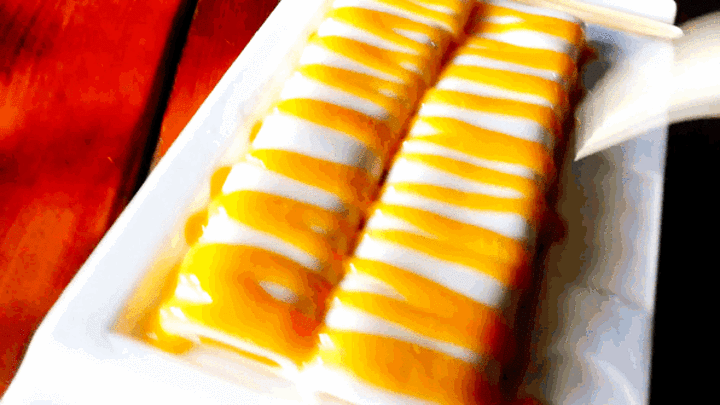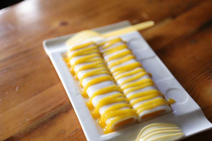 芒果肠粉,当时我把这张照片发朋友圈,我朋友圈直接炸了。根本没有见过这种东西。肠粉很多人都吃过,但是芒果肠粉简直就是迪丽希二世呀。芒果果肉被肠粉包裹着,视觉上都是一种冲击。把肠粉和芒果吃在嘴里,一股浓浓的芒果香充斥着口腔,肠粉在嘴里划动着。虽然说不是入口即化,但是这感觉妙哉妙哉。