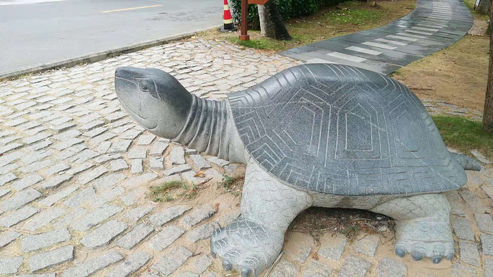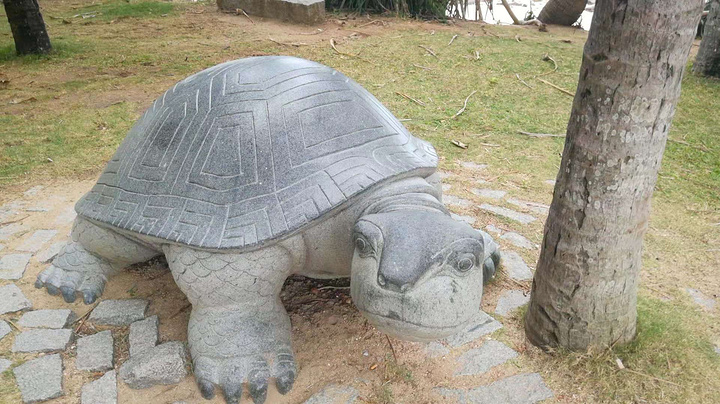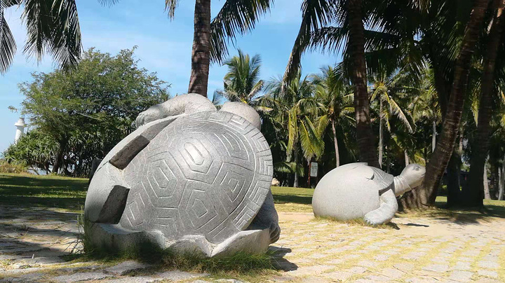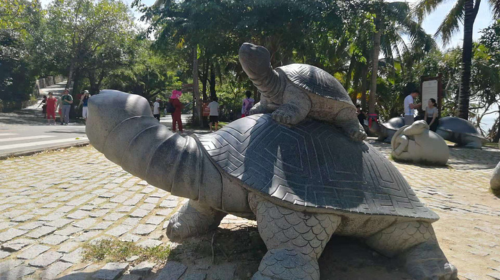 从海滩上到椰林大道的福寿阁,其前方就是九九归一景点。十只形态各异的石龟闪动着灵动的小眼睛,从不同的角度窥视着我们。最让人爱不释手的是那两只正在破壳的小龟,和那只伏在妈妈背上的小赖皮。