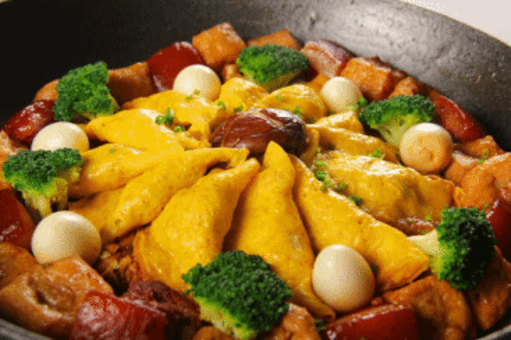 一品锅又称胡适一品锅,是徽菜的代表菜品。由一层鸡、一层鸭、一层肉、一层油豆腐等原料做成成,在配有一些蛋饺,底下是萝卜、青菜,咸鲜微辣。