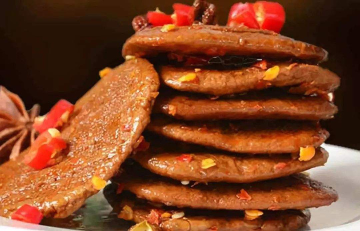 徽州风味小吃。五城茶干为徽州传统特产,始创于南宋末年理宗时期,工艺成熟于元代,隆盛于清。该茶干以配料讲究、制作精细、色香味美而著称。它是黄豆浆液过滤后,用传统方法紧压,加配料熬煮而成的。主要原配料有优质大豆、原酱、冰糖、香油、丁香、桂皮、大香等,含有植物蛋白质、还原糖等多种营养成分