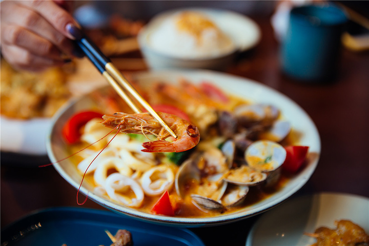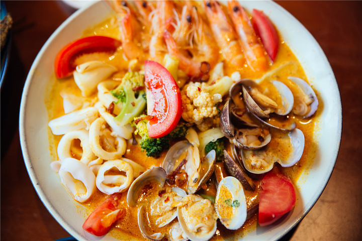 去的时候几乎都快坐满了,人多了反而感觉温暖。入座后稍等了不久,便给我们上菜了。加了咖喱的海鲜煲,有股淡淡的奶香味,里面的鱿鱼和花菜都好吃。沙爹肉串:味道还不错,炸好的肉串上撒了一些辣椒粉,但是不辣,配上沾酱超级完美。他们家咖喱味道非常正宗,服务相当热情,如果你是个咖喱迷选择他们家一定没错强推!